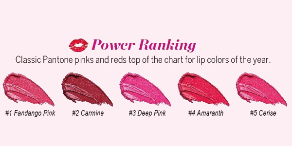 Veja a seguir as cinco cores Pantone mais procuradas durante o ano pelas mulheres para maquiar os lábios: #1 Rose Fandango #2 Carmin #3 Rose profond #4 Amarante #5 Cerise. O grande destaque foram as tonalidades rosa e vermelho.